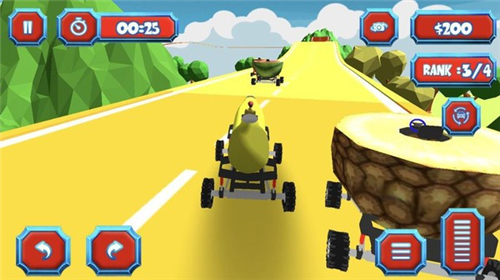 游戲中結合了多種玩法操作,玩家駕駛著賽車收集水果,擁有非??ㄍň赖挠螒虍嬅骘L格。多種水果車輛任玩家進行挑選,表現出更多的闖關特技,玩家就可以得到更高的闖關分數。