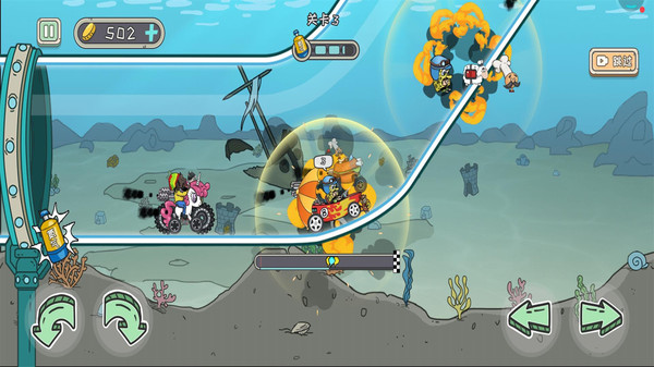 1、游戲的地圖場(chǎng)景多變,卡通的畫(huà)風(fēng),奇怪的山坡,玩家要操控飛車來(lái)爬山。