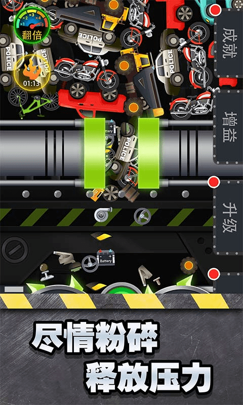 手游中你是一款可以升級你的粉碎機(jī)器,將車輛碾成碎片!玩起來很解壓,因為汽車粉碎一時爽,一直粉碎一直爽!