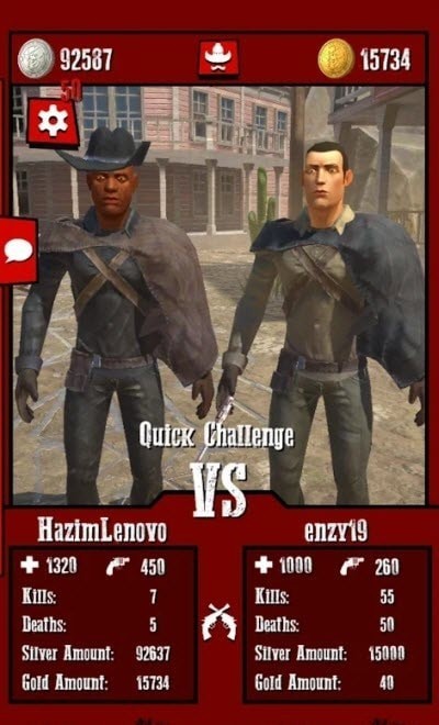 是一款人氣超火的射擊競技游戲。在游戲中充滿了西部牛仔風格,還沒開始就讓玩家感受到一種決斗槍戰(zhàn)氣息。在游戲中你要比對手先打中對方,這樣才可以獲勝,勝利的金幣可以用來升級槍械和購買新的武器。