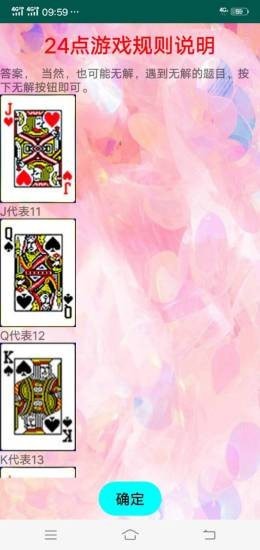這款游戲是在一副含有大小王的撲克牌共54張外加1張大王、1張大小王,總共56張撲克牌任意抽取4張撲克牌,其中A代表1,J代表11,Q代表12,K代表13,大小王代表14。