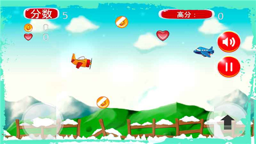 中玩家飛行的時候,會有敵人迎面而來,玩家要開火消滅他們,同時還要盡量的撿取金幣和愛心,都可以給玩家?guī)砗锰帲婕谊J關的時候盡可能的堅持住,爭取刷新自己的最高紀錄。