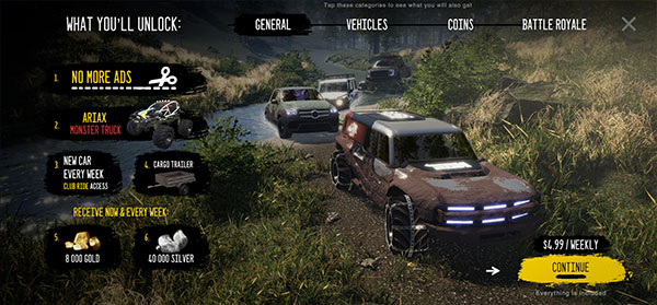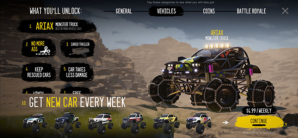 2、點擊上方【VEHTCLES】可以看到很多炫酷的越野車,點擊右下角【CONTINTUE】繼續(xù)下一步。