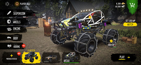 3、正式進入車輛改裝頁,可以更改輪胎、車身、引擎等,還可以選擇不同類型的車,裝備完成后就可以點擊【PLAY】開始游戲了。
