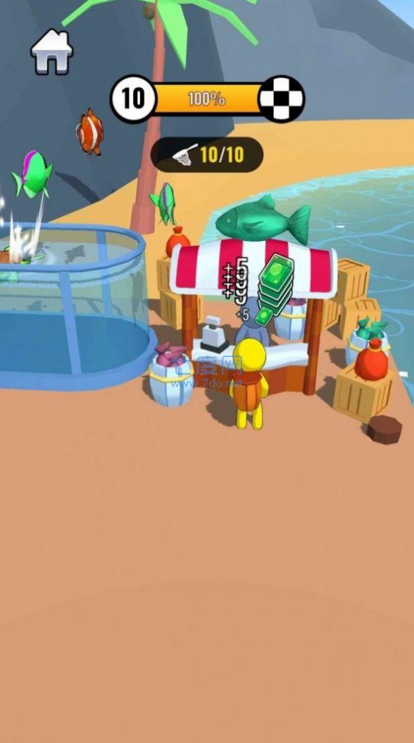 2、撒網(wǎng)捕魚,捕獲更多魚類,還有大鯊魚捕獲,注意千萬不要被拽入水中。