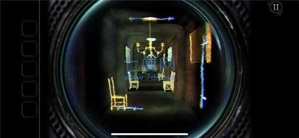 6.移動(dòng)到有巨大鏡片的板子,從鏡片里可以看到有寶石的圓臺(tái)。用目鏡觀察后,圓臺(tái)呈彩色的帶狀,箱子也發(fā)生變形。