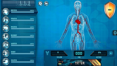 游戲共有八大系統(tǒng)(和人體一樣):循環(huán)系統(tǒng)(Circulatory)、呼吸系統(tǒng)(Respiratory)、神經系統(tǒng)(Nervous)、肌肉(Muscular)、腎臟(Renal)、骨骼(Skeletal)、消化系統(tǒng)(Digestive)、免疫系統(tǒng)(IMMUNE)。