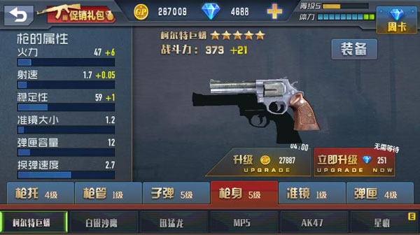 游戲內(nèi)有豐富的武器供玩家選擇,所有的武器又可分【槍托】、【槍管】、【子彈】、【槍身】、【準(zhǔn)鏡】和【彈匣】六個(gè)部件分別進(jìn)行升級(jí)。除狙擊槍外,其他槍支升級(jí)時(shí)可自由選擇金幣或者鉆石,這又該如何挑選?下面就由小編給大家做個(gè)簡(jiǎn)單介紹,如何升級(jí)武器最合理。