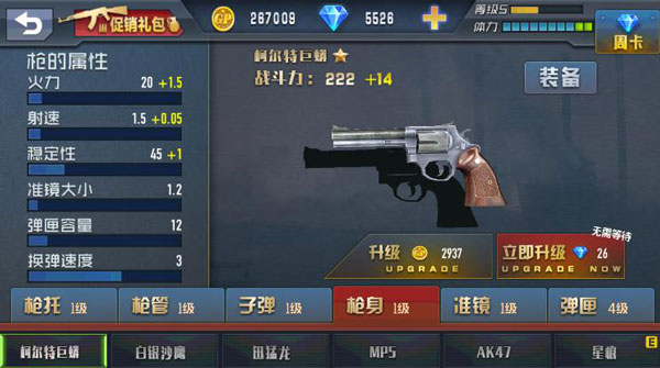 首先,升級(jí)部件先后順序如何挑選?武器升級(jí)的核心需求是為了加強(qiáng)戰(zhàn)斗力,在六個(gè)部件中,【子彈】、【槍身】和【準(zhǔn)鏡】對(duì)武器的戰(zhàn)斗力影響最大,那么在金幣或者鉆石充足的情況下,自然是優(yōu)先升級(jí)的對(duì)象?!緩椣弧筷P(guān)乎到子彈容量問題,換彈時(shí)間消耗又比較大,所以是第四選擇?!緲屚小康闹匾韵鄬?duì)【準(zhǔn)鏡】更高些,排在第五。