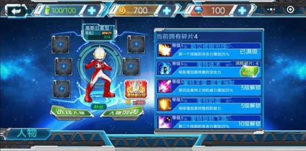 技能等級(jí)比較特殊,因?yàn)樗枰婕蚁膶?duì)應(yīng)的奧特曼碎片才能升級(jí)。