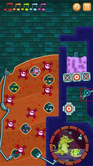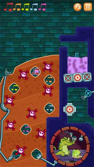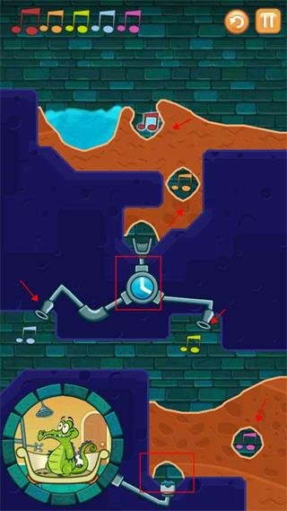 4、第二個關卡就是按正確的順序把受污染的水導入所有的音符,還要小心作為的炸彈爆炸,同時還要保證小鱷魚要有水洗澡。