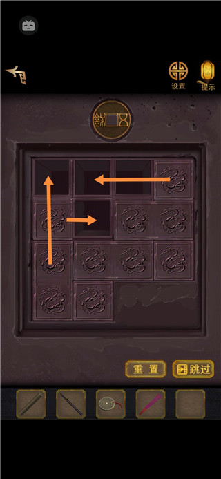 12、墻上掛畫旁邊繩子一拉,畫卷起,露出后面機關,把銅塊安上去。按印章順序拖動圖案和字。開門。