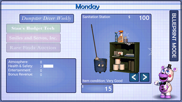 2、通過閉路監(jiān)視器來觀察玩具熊們的活動路線,控制更多的音樂和來限制玩具熊的活動