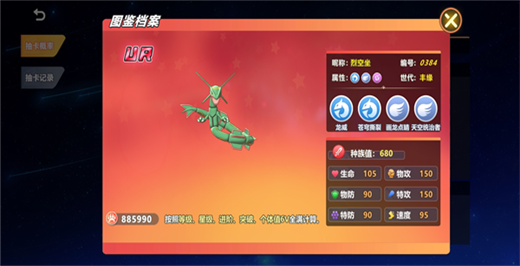 簡介:烈空坐是一條飛龍,全身大部分是綠色的,在肩和身體下方處有著紅色邊緣、像舵一樣的側(cè)翼,它的尾巴末梢上還有相似樣子的鰭。烈空坐的身體上圍繞著黃色環(huán)狀的圖案,最終延伸至頭頂上的黃色圓環(huán)。它有兩肢,上面帶著三只爪的腕子。它的頭上有兩個(gè)長而扁平的角一樣的結(jié)構(gòu),其下面還有兩個(gè)小些的角。烈空坐有突出的牙齦,在上吻部的尖端有兩顆清晰可辨的獠牙,而其他的牙齒似乎完全被它的牙齦組織包裹住了。它有小的黃色眼睛,其中有黑色的瞳孔。超級烈空坐綠色的皮膚像綠寶石般閃閃生輝。它額頭新增類似“Δ”的紋樣,牙齦組織變成了金色,下面的一對角延伸至嘴部前方呈拱衛(wèi)狀,并且上角、下角和尾端有著類似綢帶的金色長狀物,連在下角上的觸須有類似“∞”的圖樣,原本環(huán)狀圖案的位置鑲嵌著發(fā)光的金色寶玉。