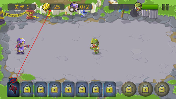 英雄的子彈會(huì)用光,當(dāng)英雄的頭上出現(xiàn)無(wú)彈夾圖標(biāo)時(shí),玩家需要點(diǎn)擊英雄幫助它們補(bǔ)充彈藥。上方會(huì)顯示進(jìn)度條,當(dāng)進(jìn)度條滿了的時(shí)候就出來(lái)最后一波僵尸。需要注意方英雄頭像圖標(biāo),會(huì)顯示關(guān)卡限制犧牲英雄的數(shù)量,如果超過(guò)就會(huì)失敗。