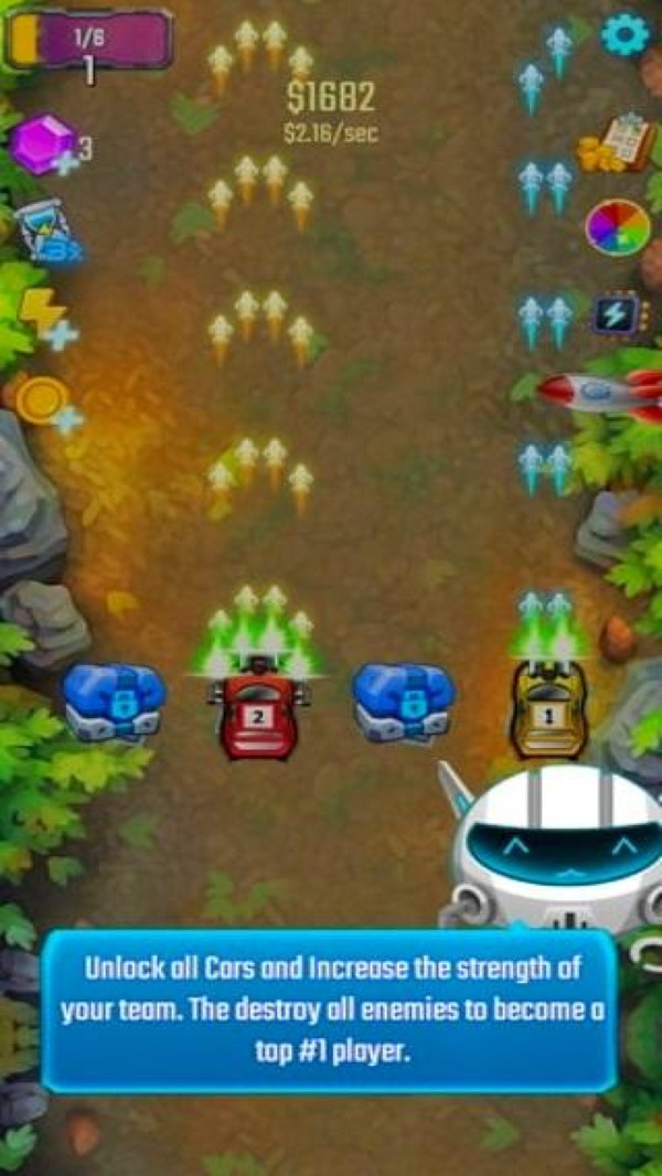 1、升級汽車以釋放超級力量,將它們合成并獲得更強攻擊能力的提升