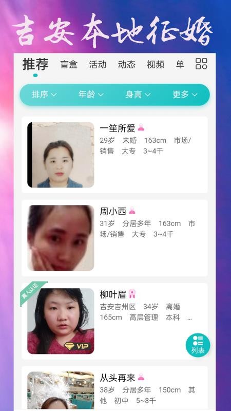 是吉安地區(qū)*真實(shí)的相親征婚網(wǎng)站,立足吉安市吉州區(qū)、青原區(qū)、井岡山市及吉安縣、泰和縣、萬安縣、遂川縣、永新縣、永豐縣、吉水縣、峽江縣、安??h、新干縣各縣,會(huì)員資料真實(shí)靠譜,戶籍及工作地址精準(zhǔn)到各鄉(xiāng)鎮(zhèn),通過網(wǎng)站系統(tǒng)、手機(jī)APP,微信公眾號(hào)、小程序等先進(jìn)的互聯(lián)網(wǎng)技術(shù),服務(wù)于全世界吉安籍單身離婚男女,實(shí)現(xiàn)快速、互動(dòng)、真實(shí)的相親征婚線下交友,采用人工智能庫身份認(rèn)證,真人效驗(yàn)、人臉識(shí)別、活體檢測(cè)、反欺詐庫、反失信人員庫、通訊三網(wǎng)聯(lián)合等先進(jìn)的認(rèn)證驗(yàn)證方式,為吉安相親征婚人士保駕護(hù)航。紅娘服務(wù),大型相親征婚聯(lián)誼活動(dòng)、快捷方便的自助交友、一對(duì)一本地人工紅娘、兼職紅娘、心理咨詢情感撫慰等眾多服務(wù)模式,吉安的單身男女想要收獲真實(shí)靠譜的愛情姻緣就來。