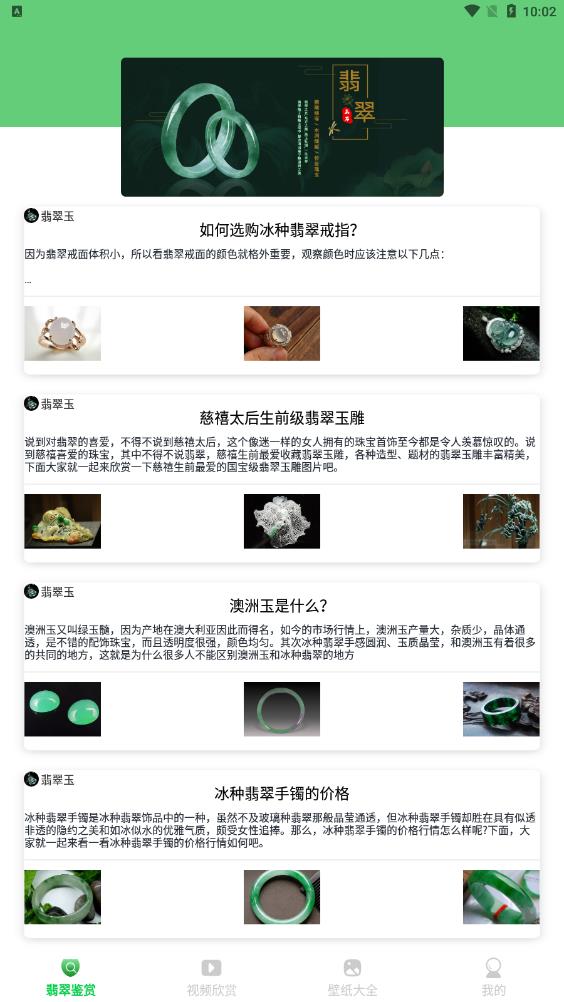 3、軟件導(dǎo)入了非常豐富的各種翡翠以及玉器還有耳飾掛件的壁紙以及視頻內(nèi)容,所有內(nèi)容都是直接來進行上傳,讓用戶自己更好的了解和增長見識。