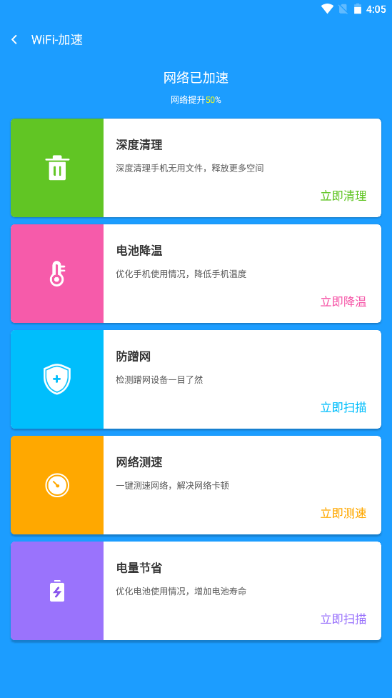 3、用戶們可以直接使用軟件來進(jìn)行WiFi加速,強(qiáng)大的加速功能,可以讓你的網(wǎng)路突破極限,讓你可以更快速地進(jìn)行觀影或者游戲;
