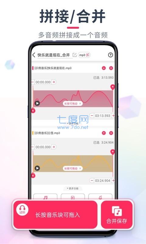2、音頻合并:各類音頻,無縫合拼接合成,編輯自己喜愛的音頻鈴聲MP3;