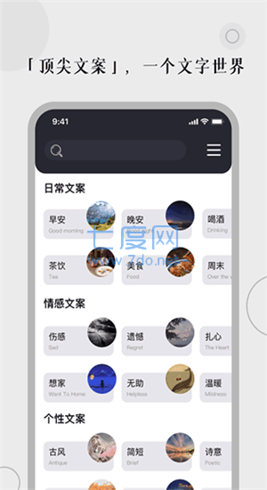 你是否經(jīng)常被一句唯美的句子打動(dòng),是否偶爾碰到一句犀利的言辭,有種醍醐灌頂?shù)母杏X。今天小編為大家?guī)砹薬pp,這是一款擁有優(yōu)質(zhì)文案內(nèi)容的軟件,為用戶提供許多文案示例供你閱讀和參考,輕松剪切各種精彩片段,讓你的文案變得更加的優(yōu)美高大尚,還能自定義設(shè)置各種閱讀體驗(yàn),十分的好用,有需要的朋友快來下載使用吧。