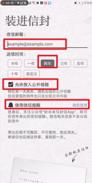 4、最后整理“收信郵箱”、“送信時(shí)間”、“是否允許公開”及“微信提醒”等信息即可;