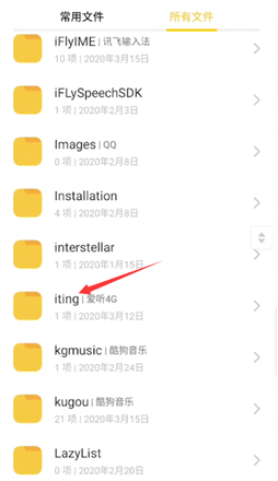 打開(kāi)手機(jī)文件管理,點(diǎn)擊手機(jī)存儲(chǔ),往下滑找回iting文件夾,