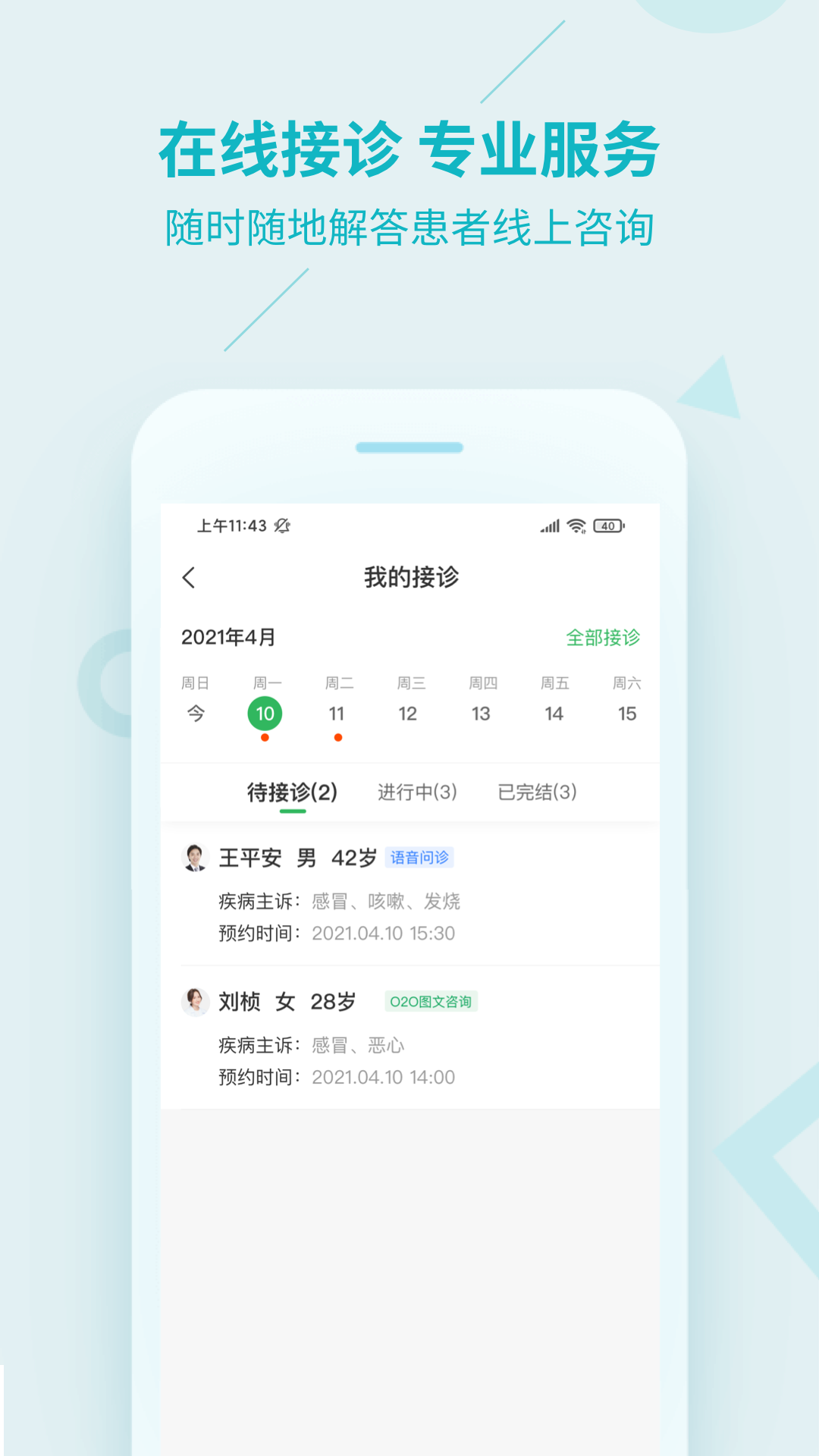 【在線接診】開通服務(wù)后,患者可在用戶版APP中看到醫(yī)生主頁和服務(wù)內(nèi)容,可隨時下單咨詢。