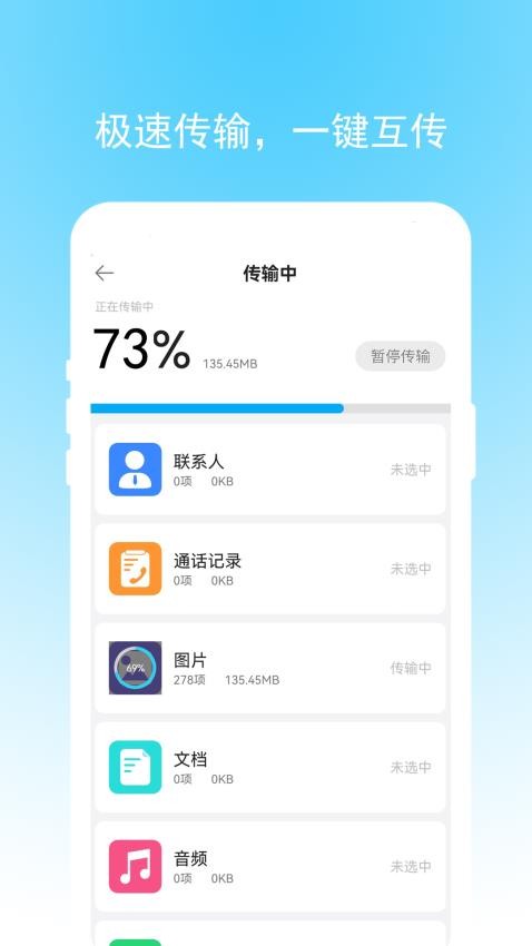 3、支持各種手機(jī)品牌的互相傳輸,方便用戶輕松傳輸相關(guān)的文件數(shù)據(jù),快捷傳輸。