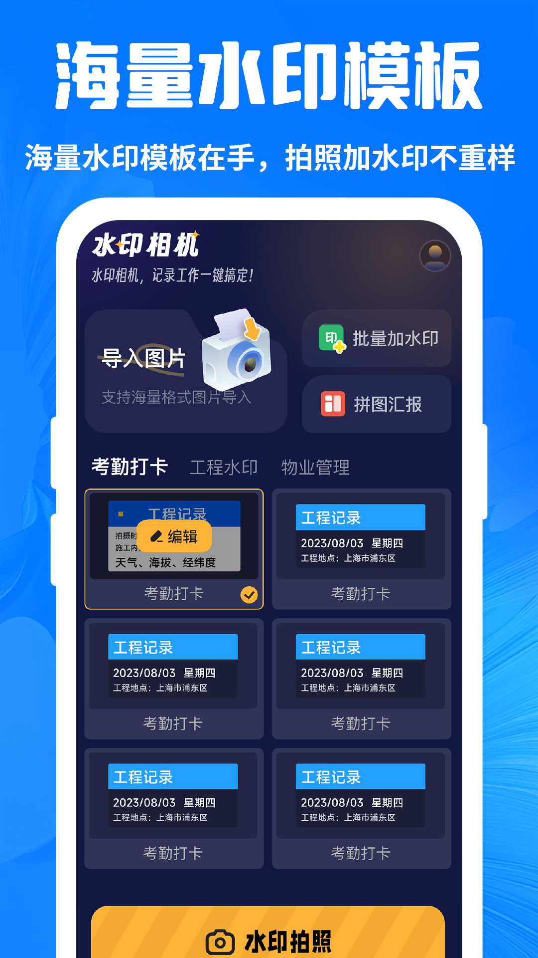 今拍水印相機打卡app是一款多功能的水印打卡相機軟件,能夠給大家提供各種優(yōu)質(zhì)的相機操作。提供了海量水印模板,能夠自由使用,輕松制作各種圖片。能夠支持工作圖文匯報操作,可以清晰展示自己的匯報內(nèi)容。可以自由編輯水印,支持各種編輯工具,滿足大家的制作需求。