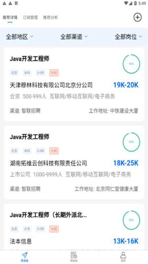 1、智能職位搜索:支持30余個篩選條件組合查詢,結果按匹配度智能排序,提供精準的崗位推薦。