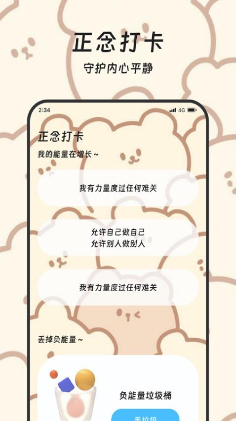 3、為用戶提供了線上專屬的負能量垃圾桶,將自己的煩惱和負能量情緒一鍵丟掉。