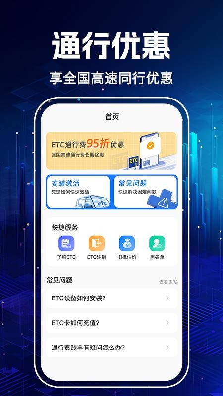 2、為用戶提供了高效便捷的ETC出行服務(wù),進(jìn)而可以讓你提高出行的下來,節(jié)省高速通行的排隊(duì)時(shí)間。