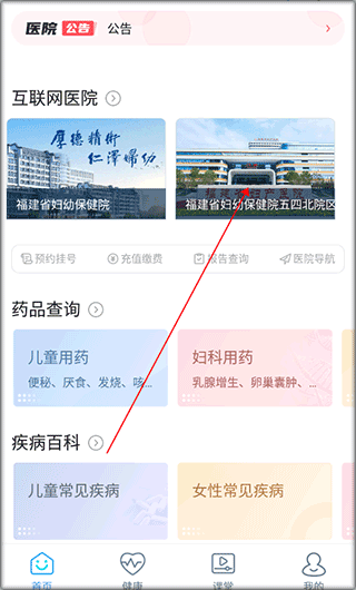 1、進入福建省婦幼保健院app的首頁,選擇院區(qū)。