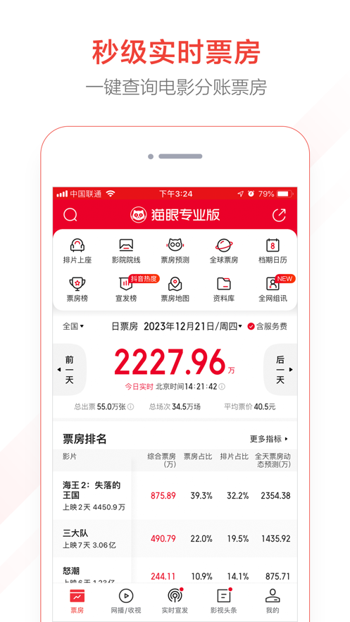 1. 秒級實時票房:國內(nèi)首款秒級實時票房查詢工具,每分每秒掌握電影市場實時動態(tài);